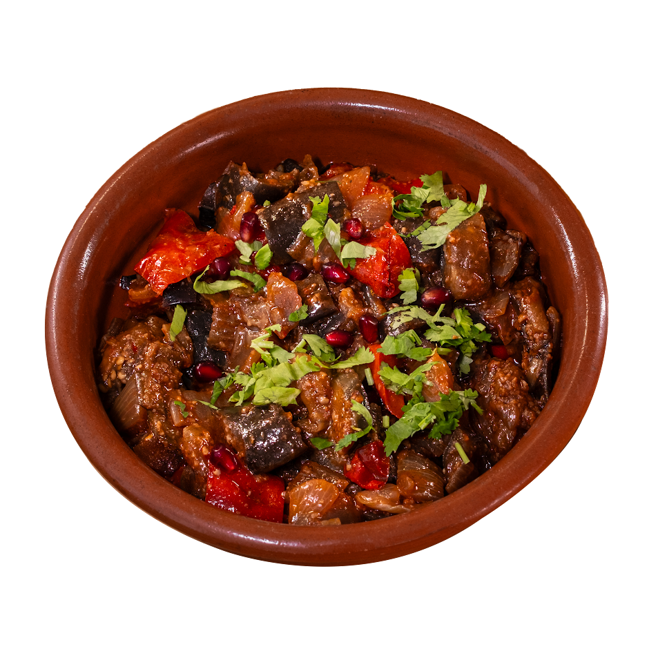 baked with pomegranate and soy sauce, served with red onion, sprinkled with cilantro and pomegranate seeds